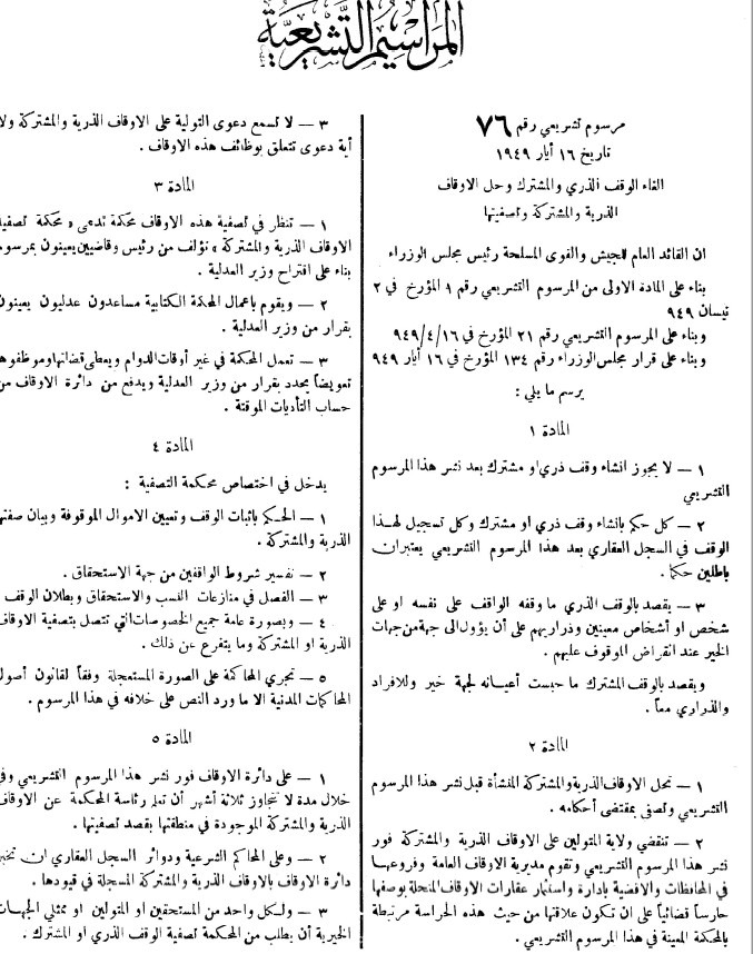 لقد كان هنالك خلل بيّن بإدارة الأوقاف في تلك الآونة، ولكن بدلاً من الإصلاح كان الإلغاء والعلاج بالكرباج، فألغى المرسوم الأول الوقف الذُّري والمشترك، وأناط بمديرية الأوقاف العامة وفروعها في المحافظات إدارة عقارات هذه الأوقاف وبيعها واستثمارها، وأنهى المرسوم الثاني ولاية المتولين على الأوقاف، وكلّف مديرية الأوقاف العامة إدارة الأوقاف الإسلامية على الصورة التي تحقق مصالح المسلمين دون التقيّد بشرط الواقف ضارباً بذلك القاعدة الراسخة والصخرة الصلبة التي قام عليها بنيان الأوقاف الهائل: (شرط الواقف كنصّ الشارع)، ثم توالت المراسيم الجائرة المتلاعبة المنتهكة في فترة حكم عبد الناصر إبان الوحدة مع مصر، ثم في فترة حكم الطغمة البعثية ثم الأسدية.